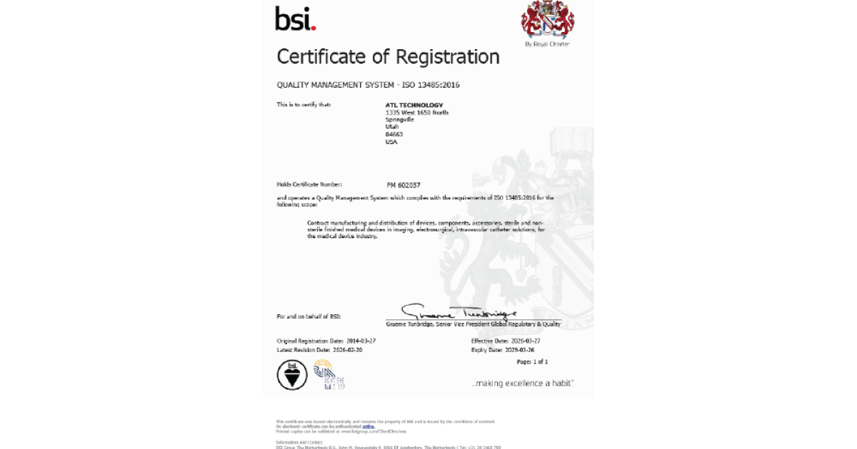 ATL Medical maintains the certifications and quality systems required to support global medical device development and manufacturing. Our facilities are registered with the FDA and certified to ISO 13485, with cleanroom environments that are certified or compliant across all manufacturing sites. We adhere to Current Good Manufacturing Practices (cGMP) and maintain ITAR compliance where applicable.